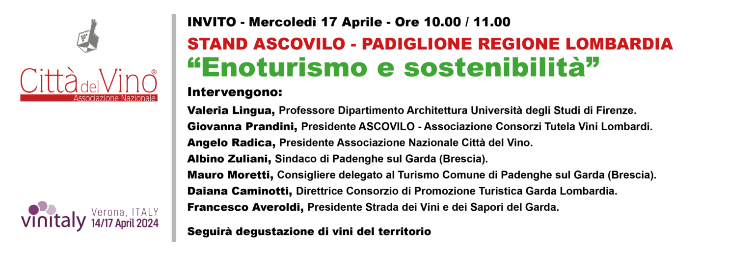 VINITALY – Mercoledì 17 Aprile alle ore 10 presso il padiglione della Regione Lombardia allo stand di Ascovilo, l’Associazione Consorzi Tutela Vini Lombardi a D.O.C.G. , D.O.C e I.G.T, si parlerà di sostenibilità e turismo in relazione al PRG – Piano Regolatore delle Città del Vino e alle esperienze lombarde dei territori del Garda bresciano. Tra gli interventi anche il Presidente di Città del Vino, Angelo Radica.
